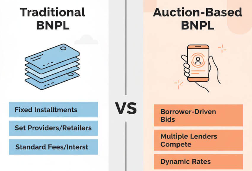 To understand how this works in practice, let’s compare traditional BNPL with auction-based models: